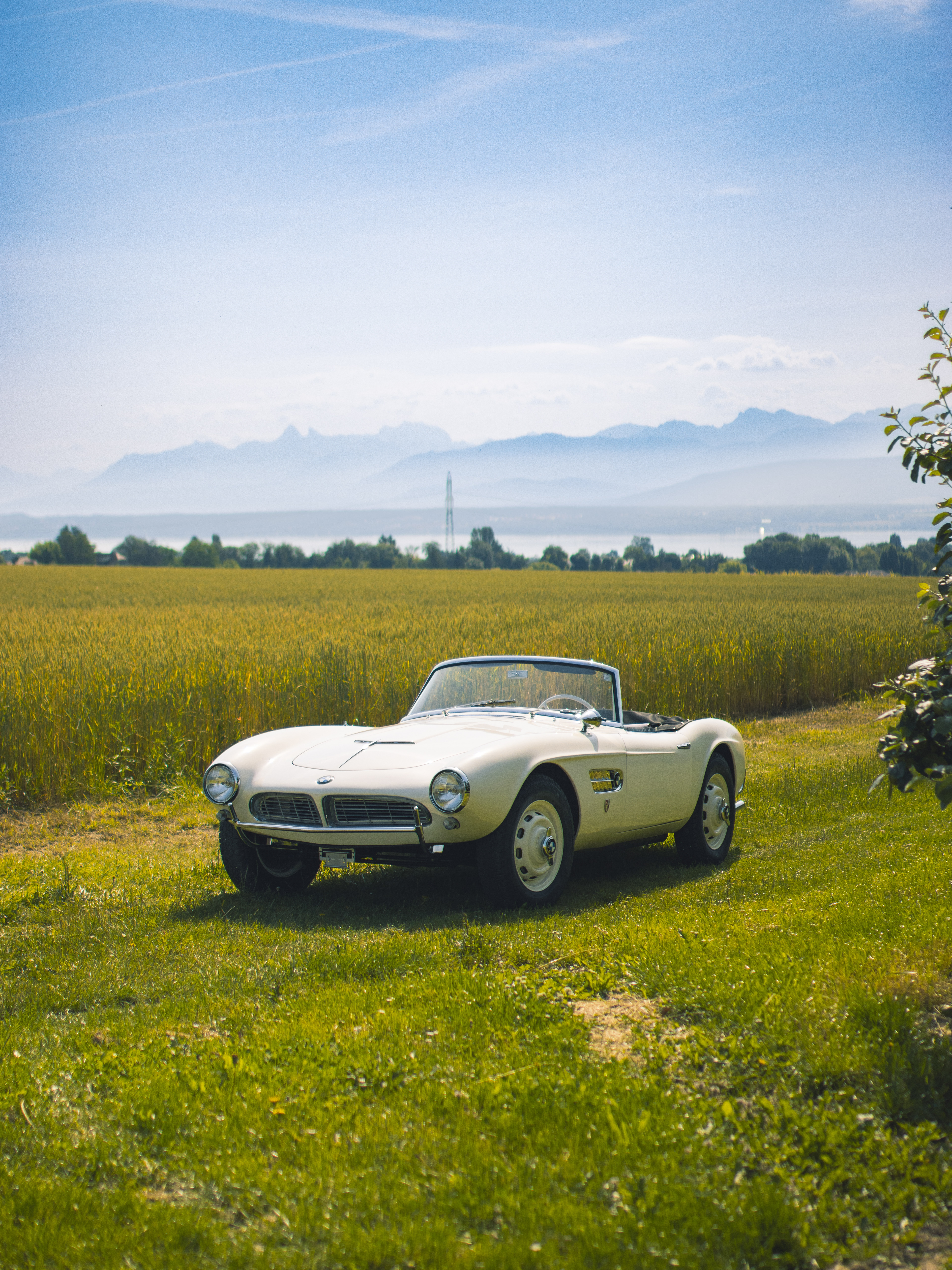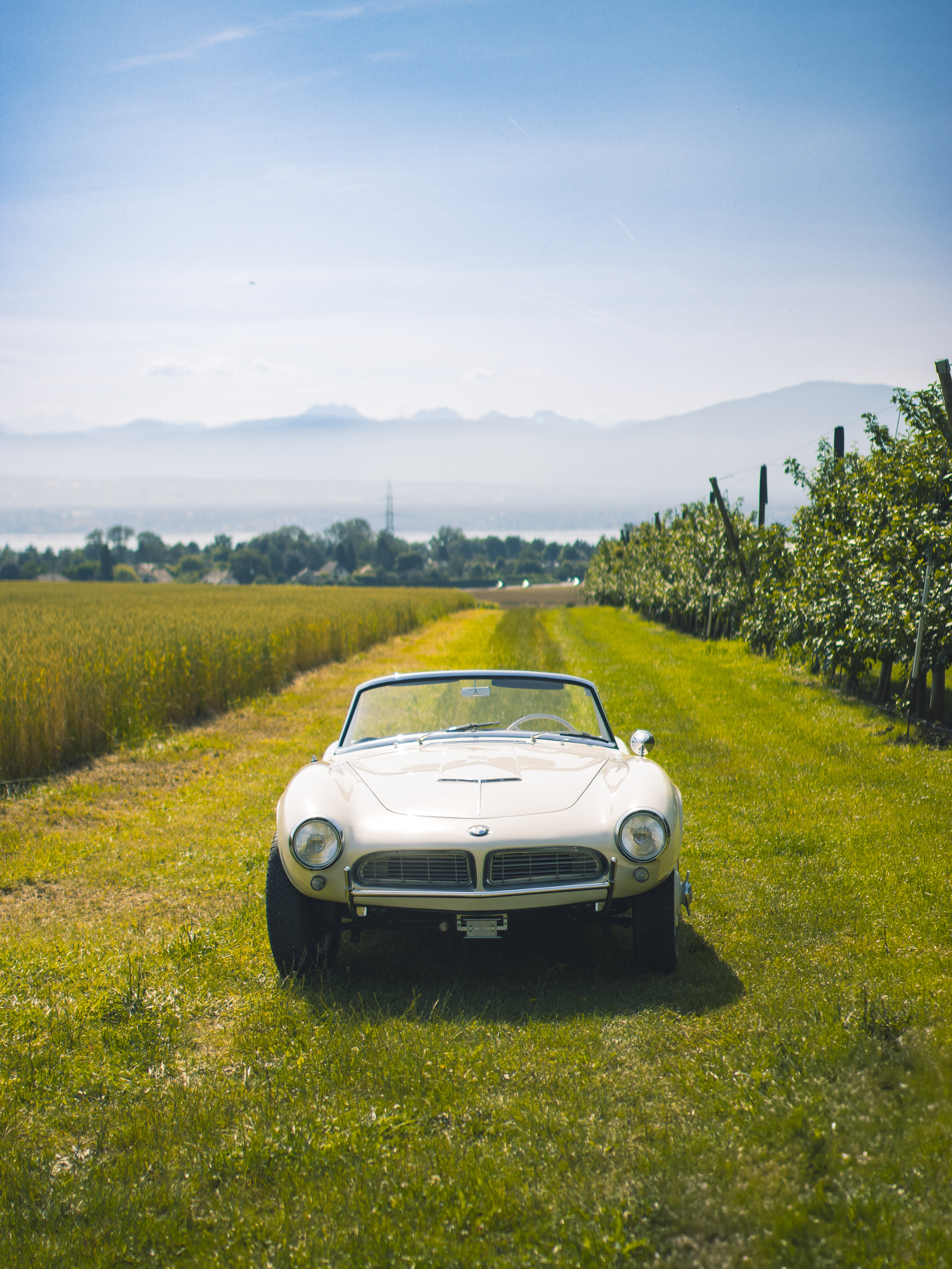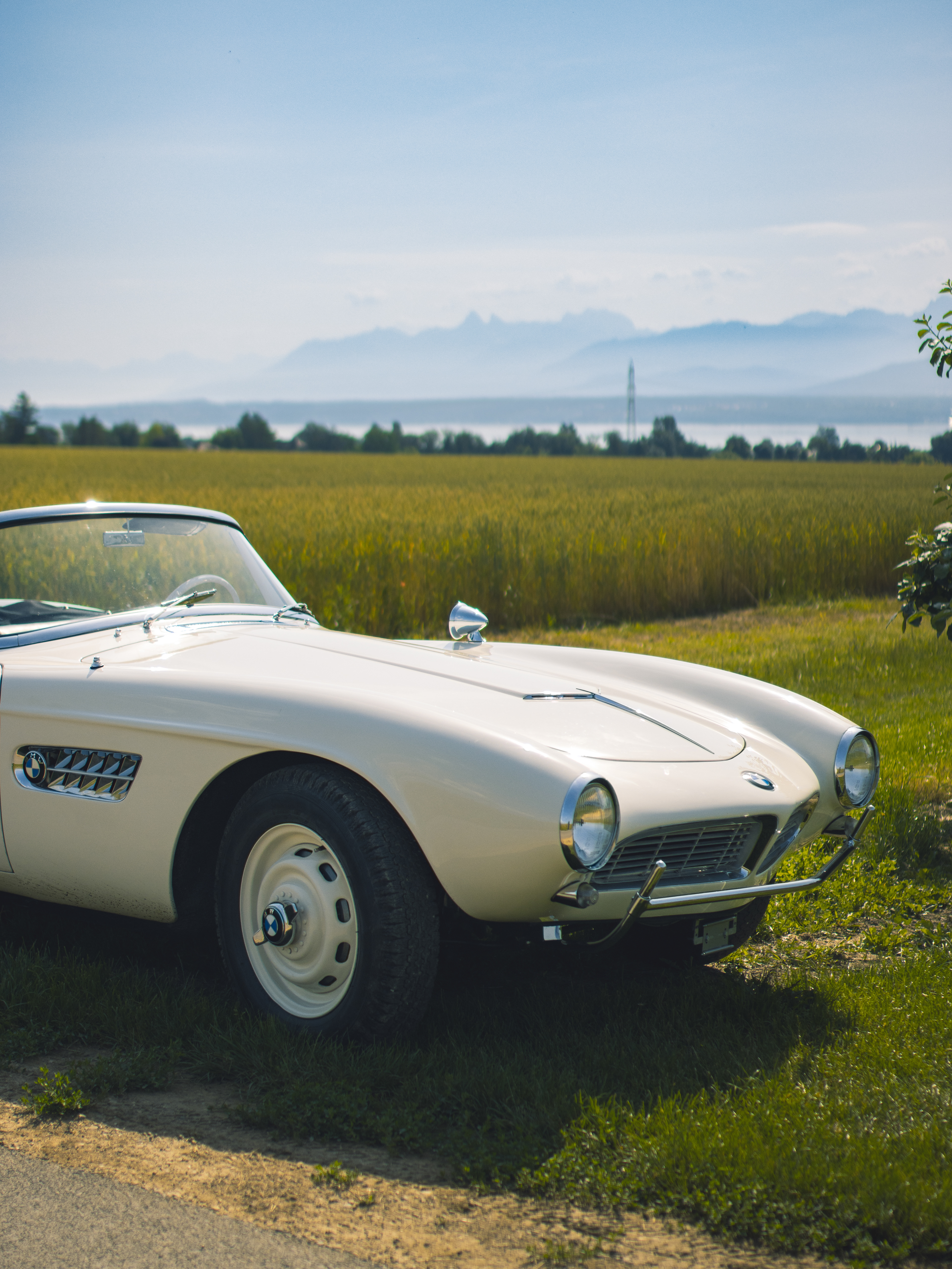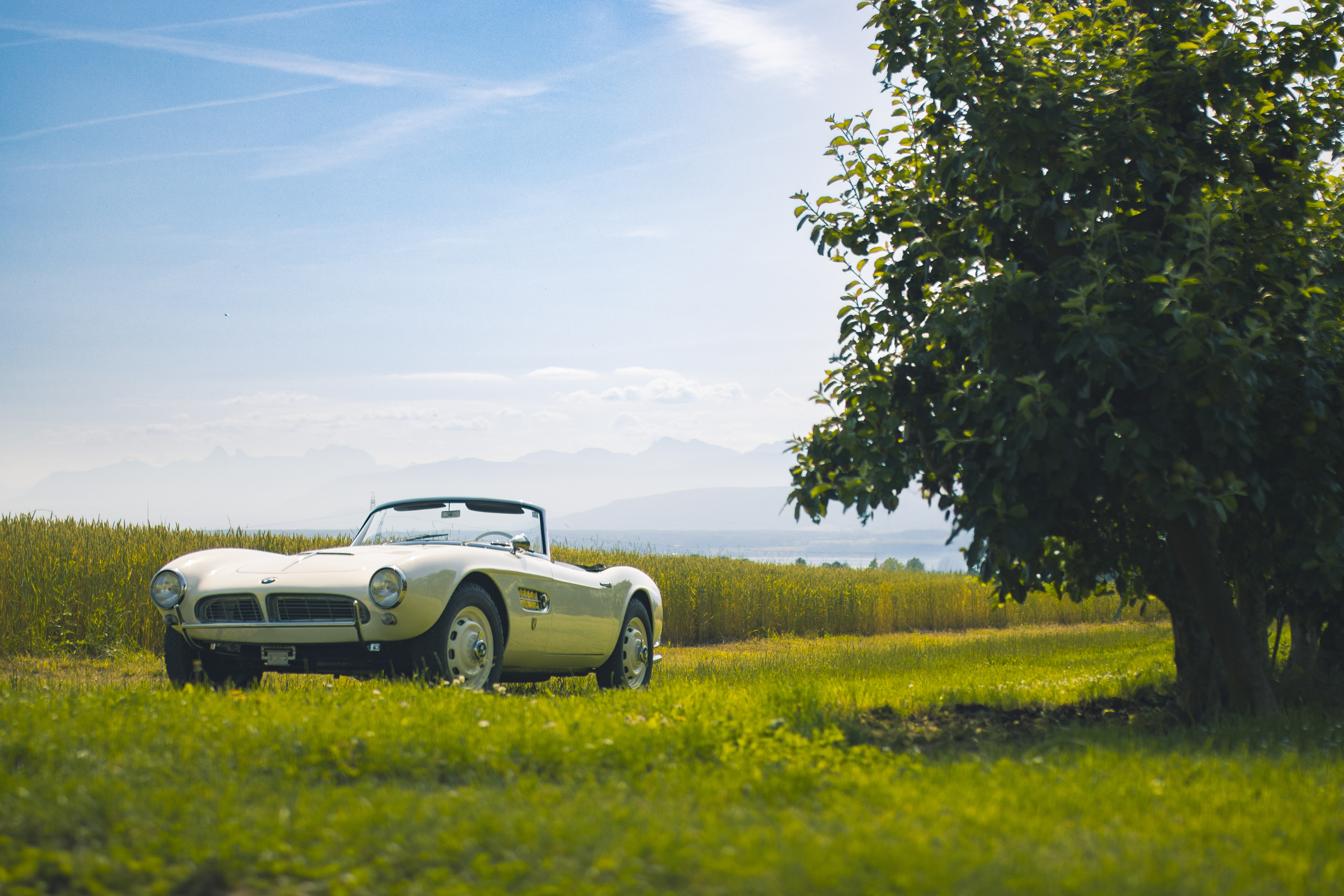 BMW 507 photographiée dans un champ surplombant le lac Léman.