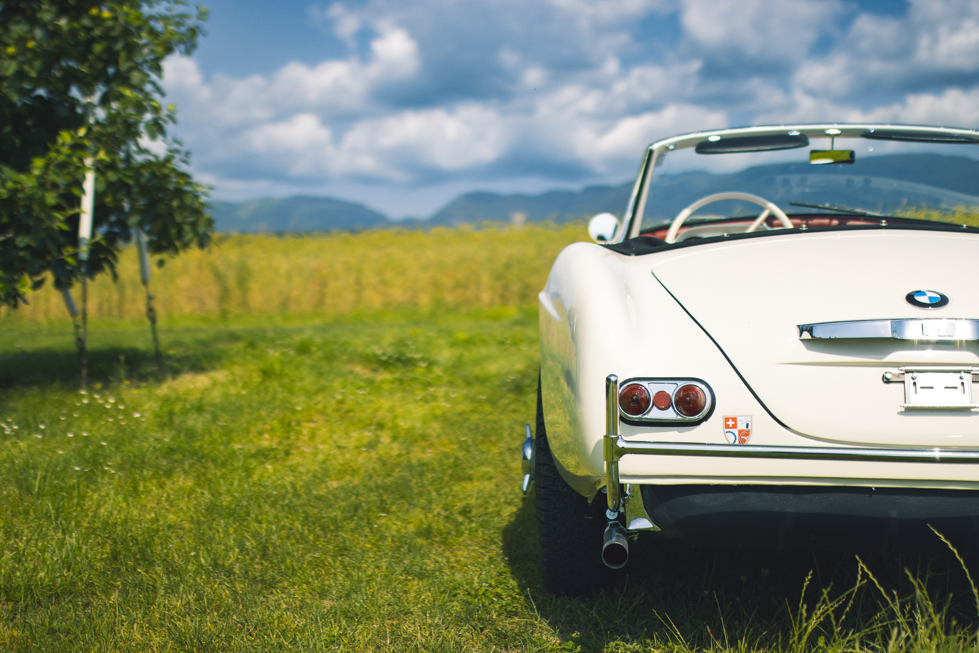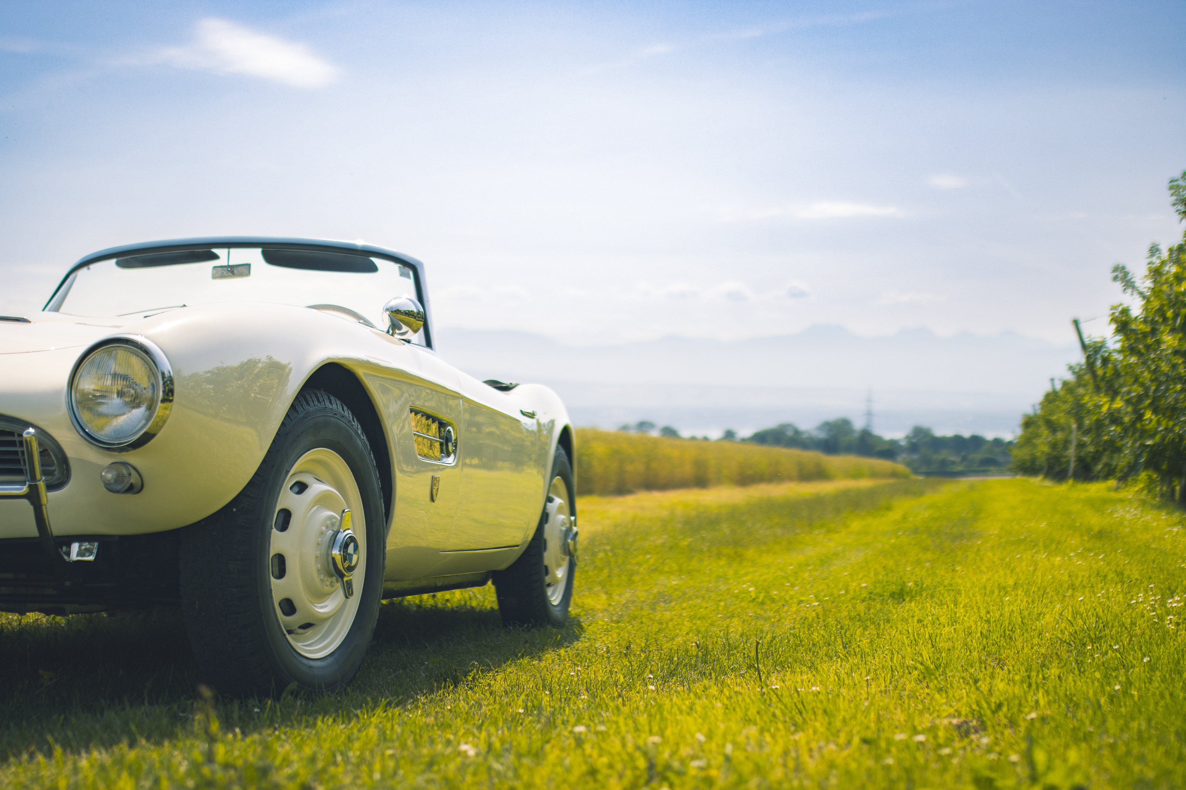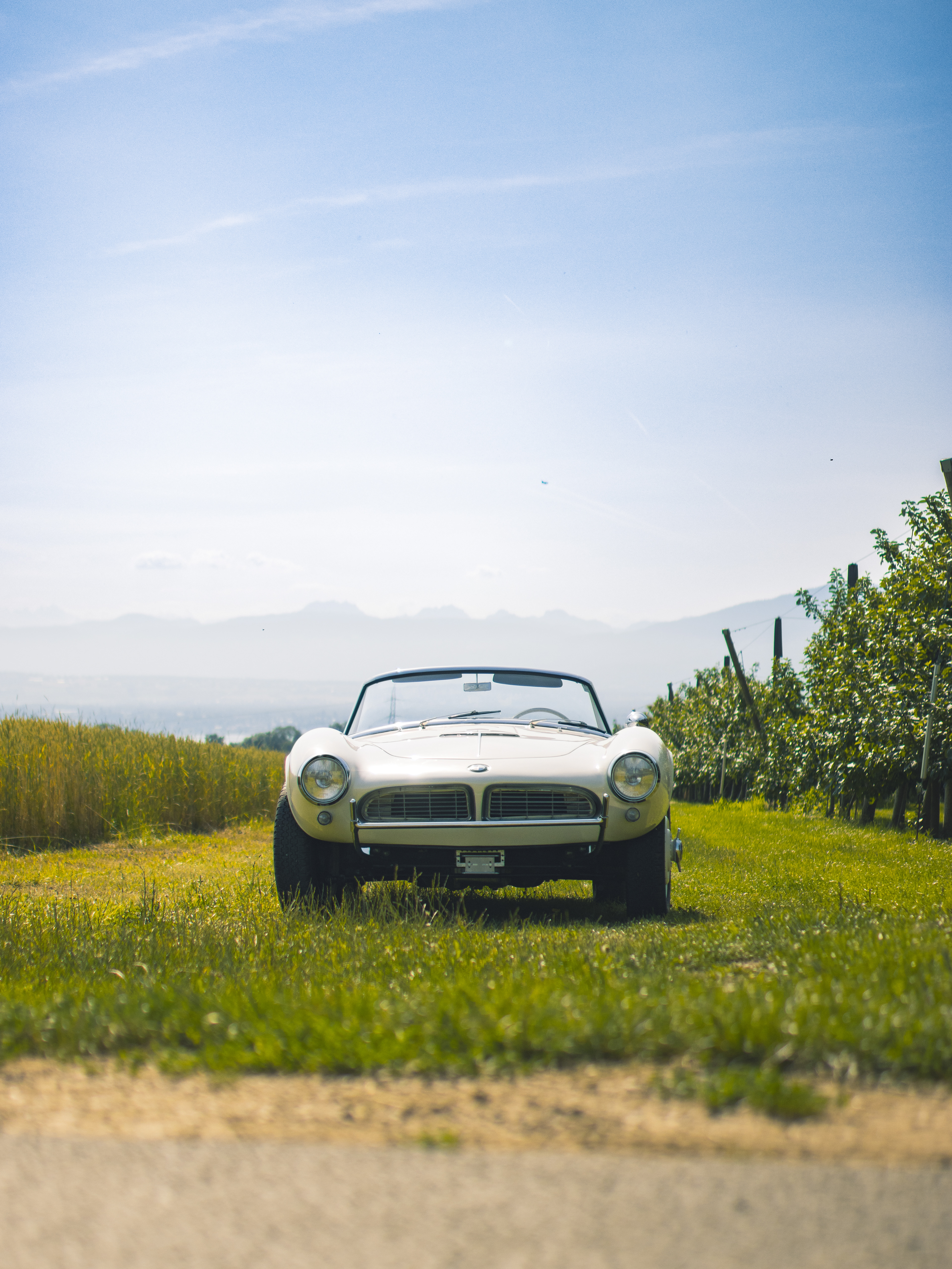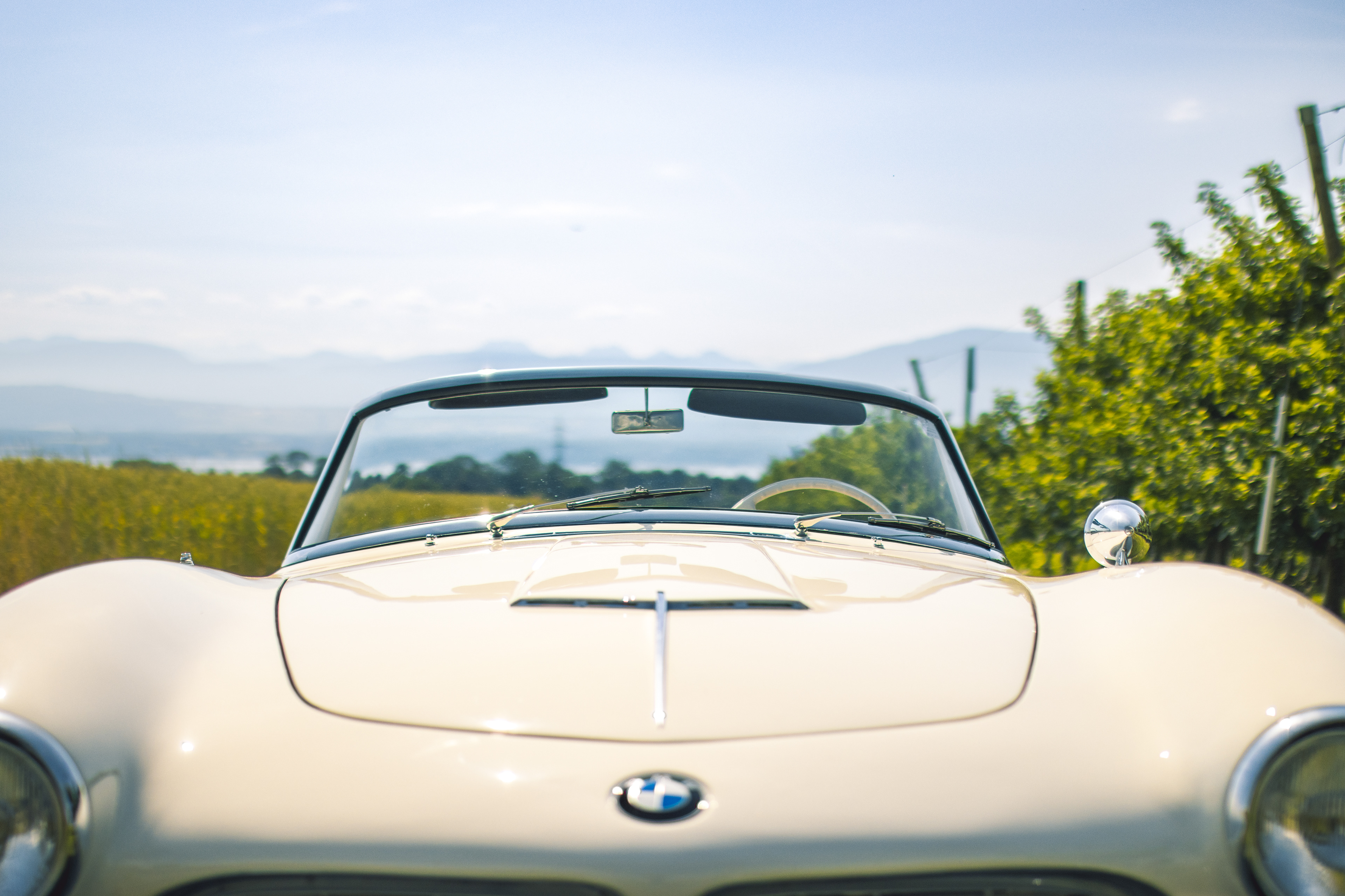 BMW 507 photographiée dans un champ surplombant le lac Léman.