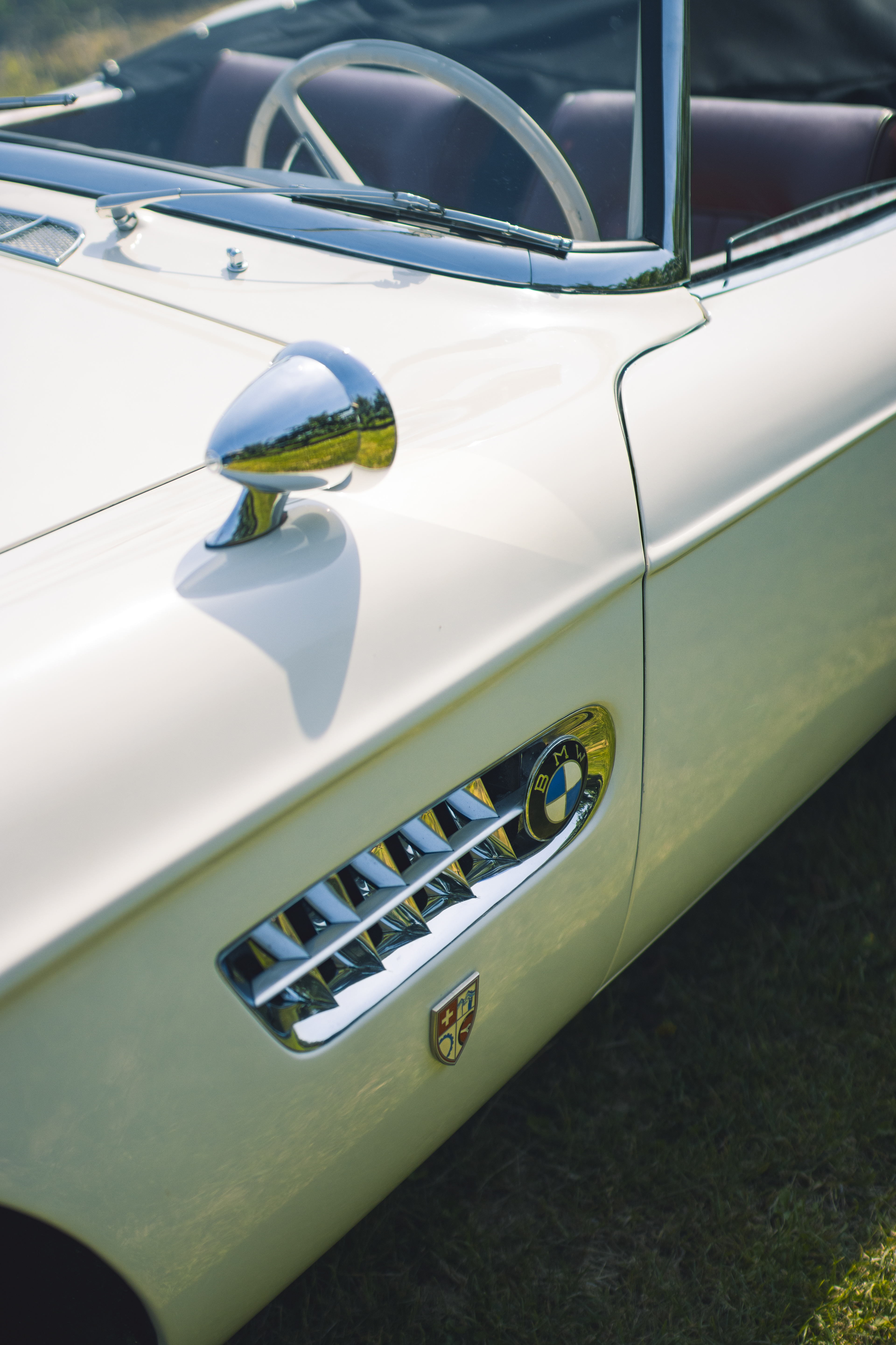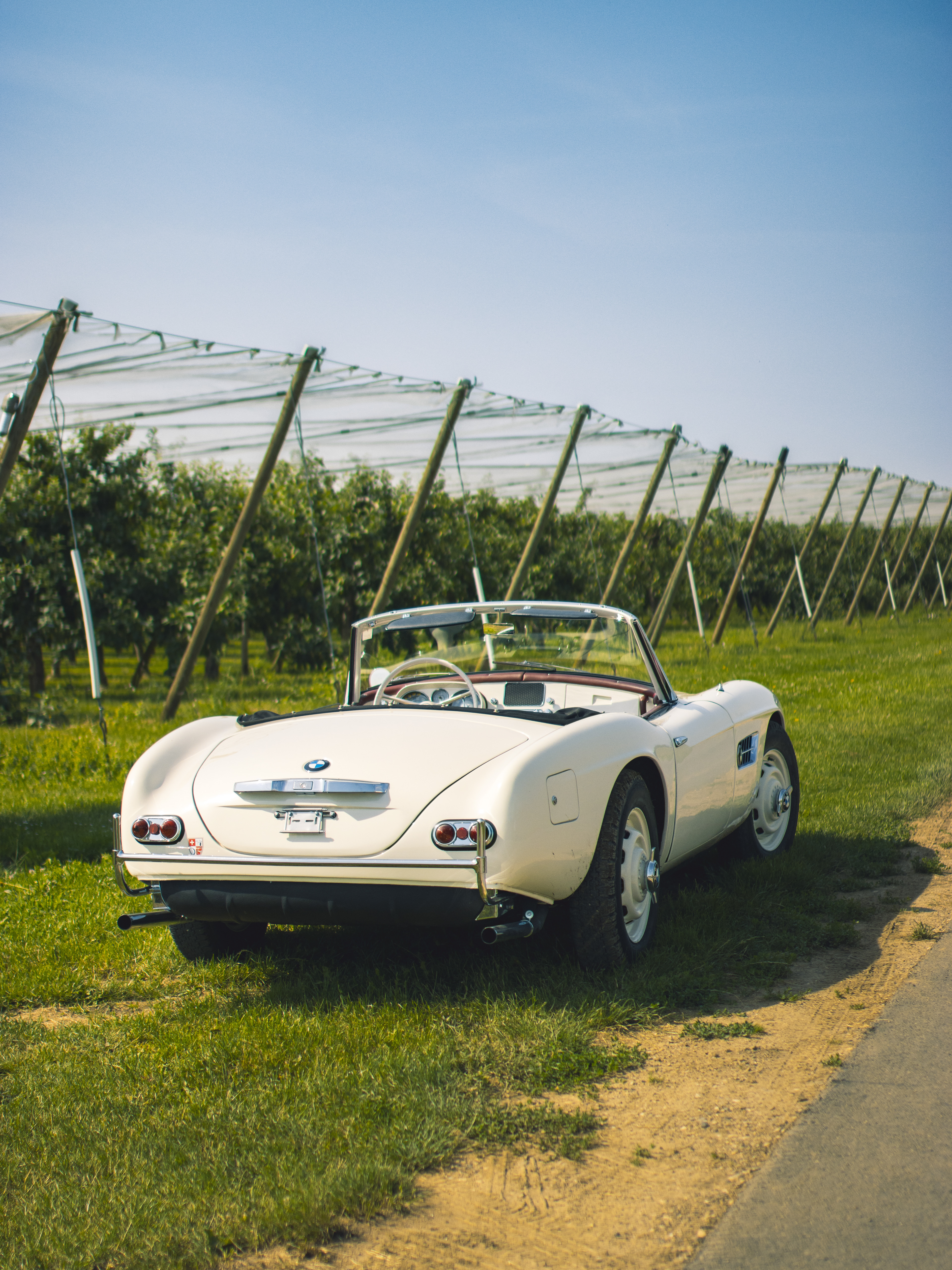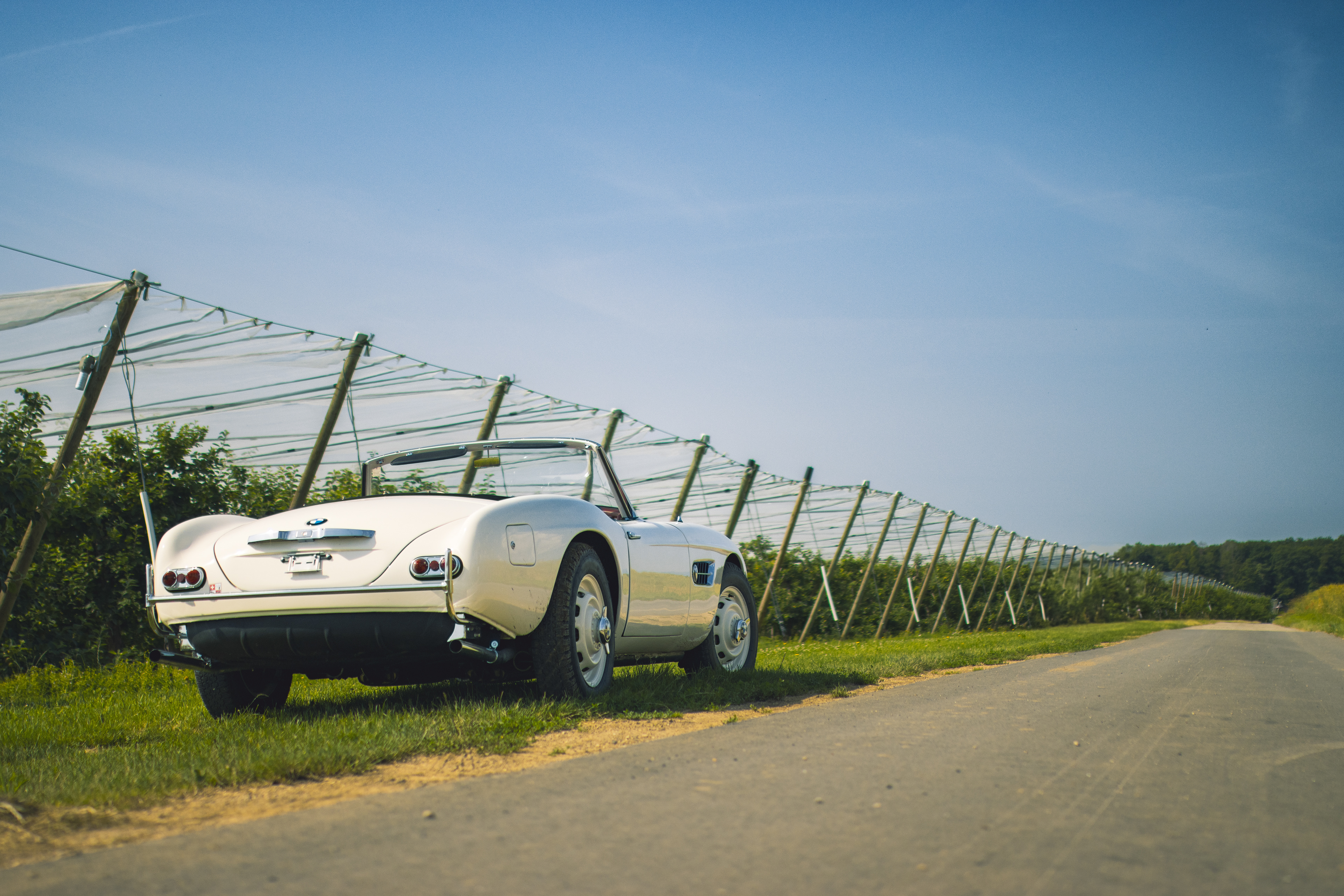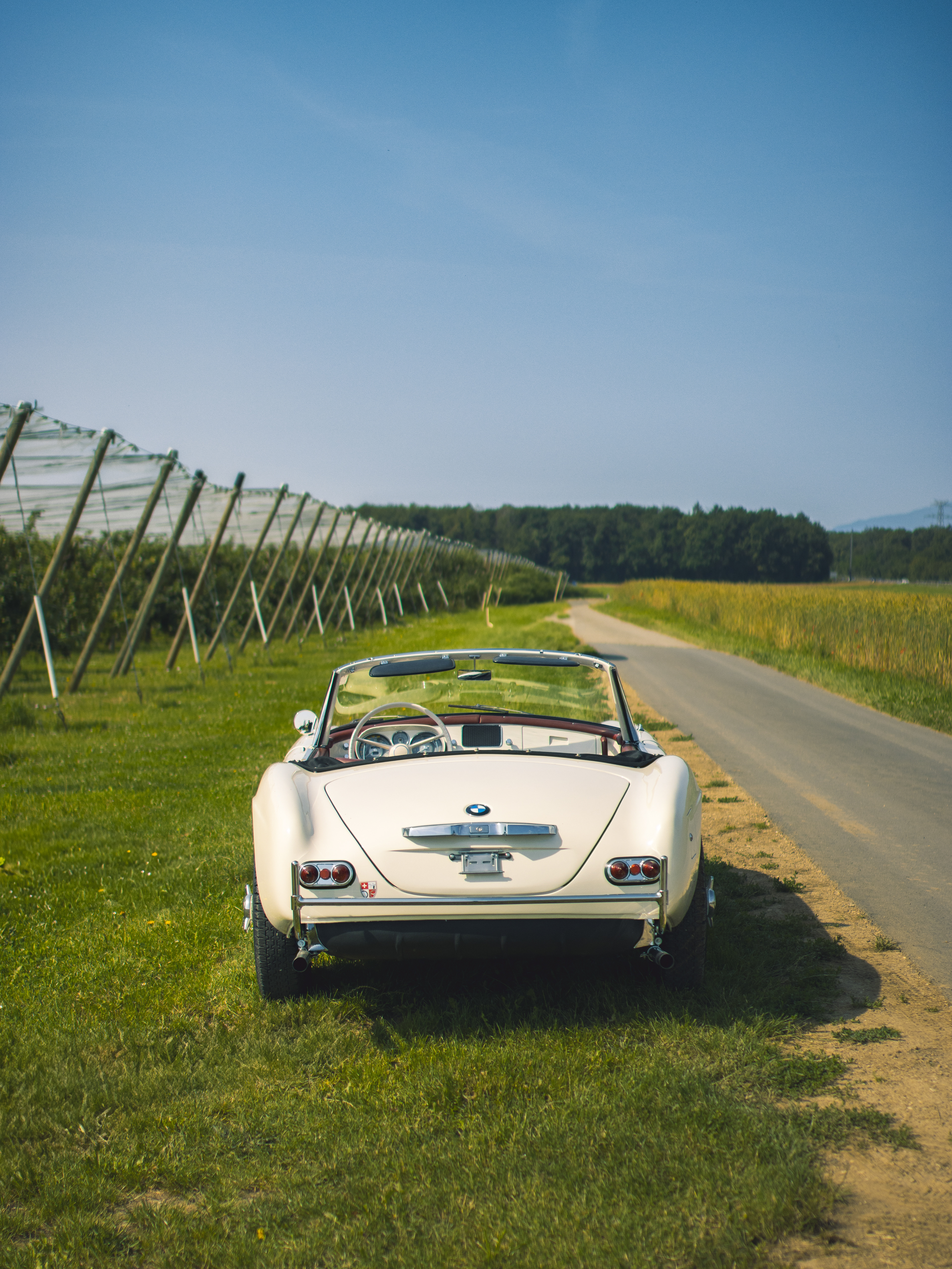 BMW 507 photographiée dans un champ surplombant le lac Léman.