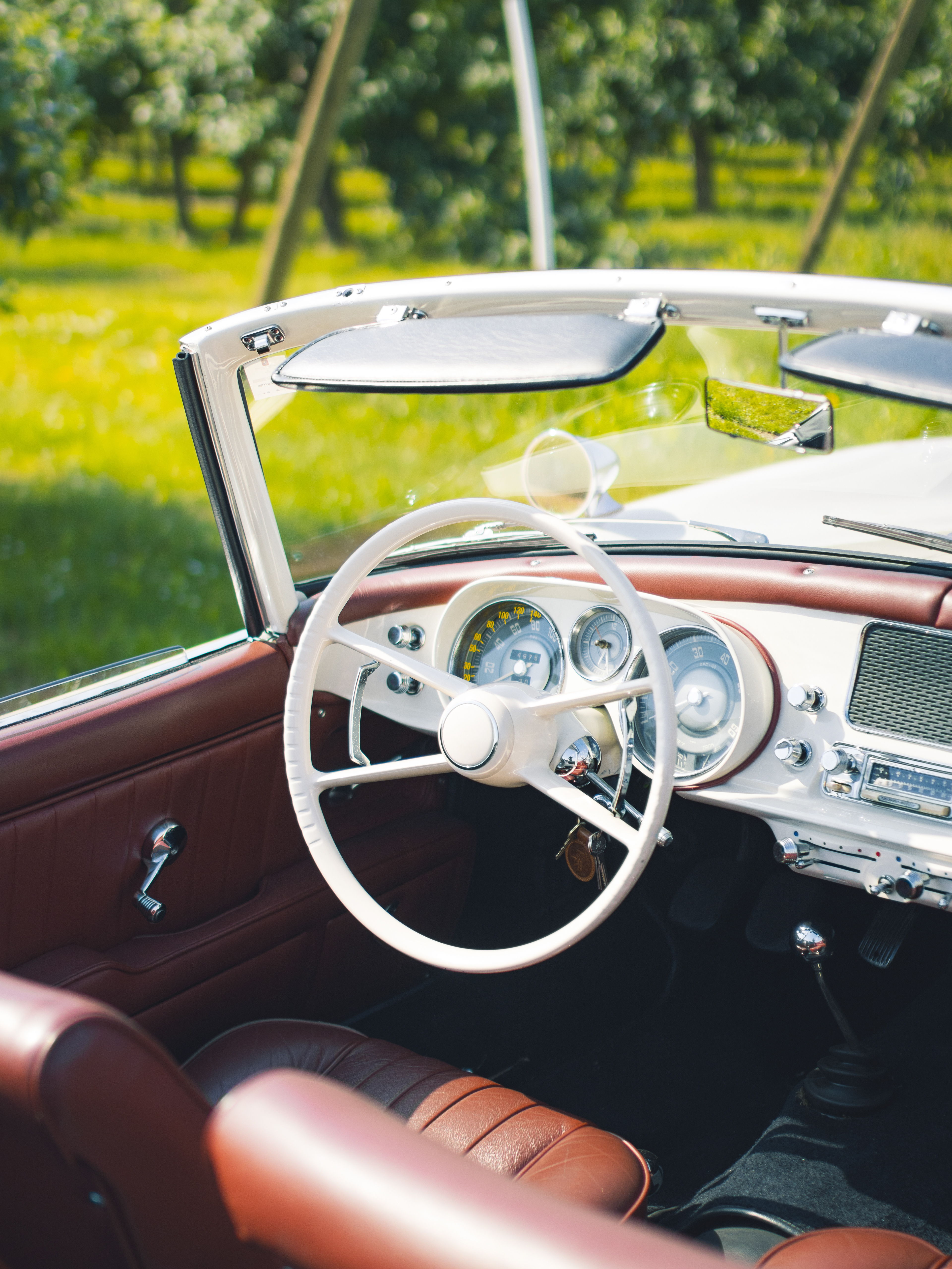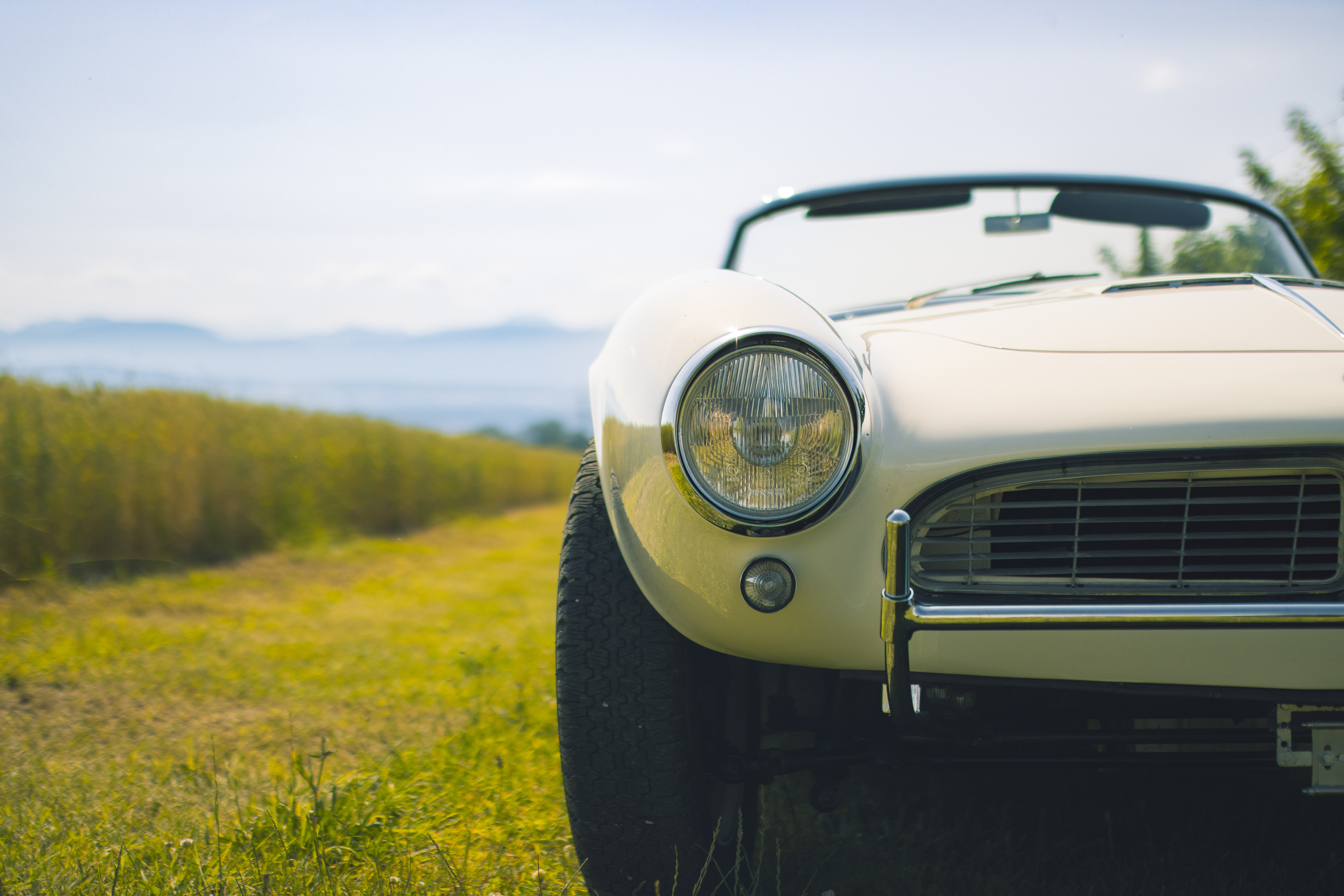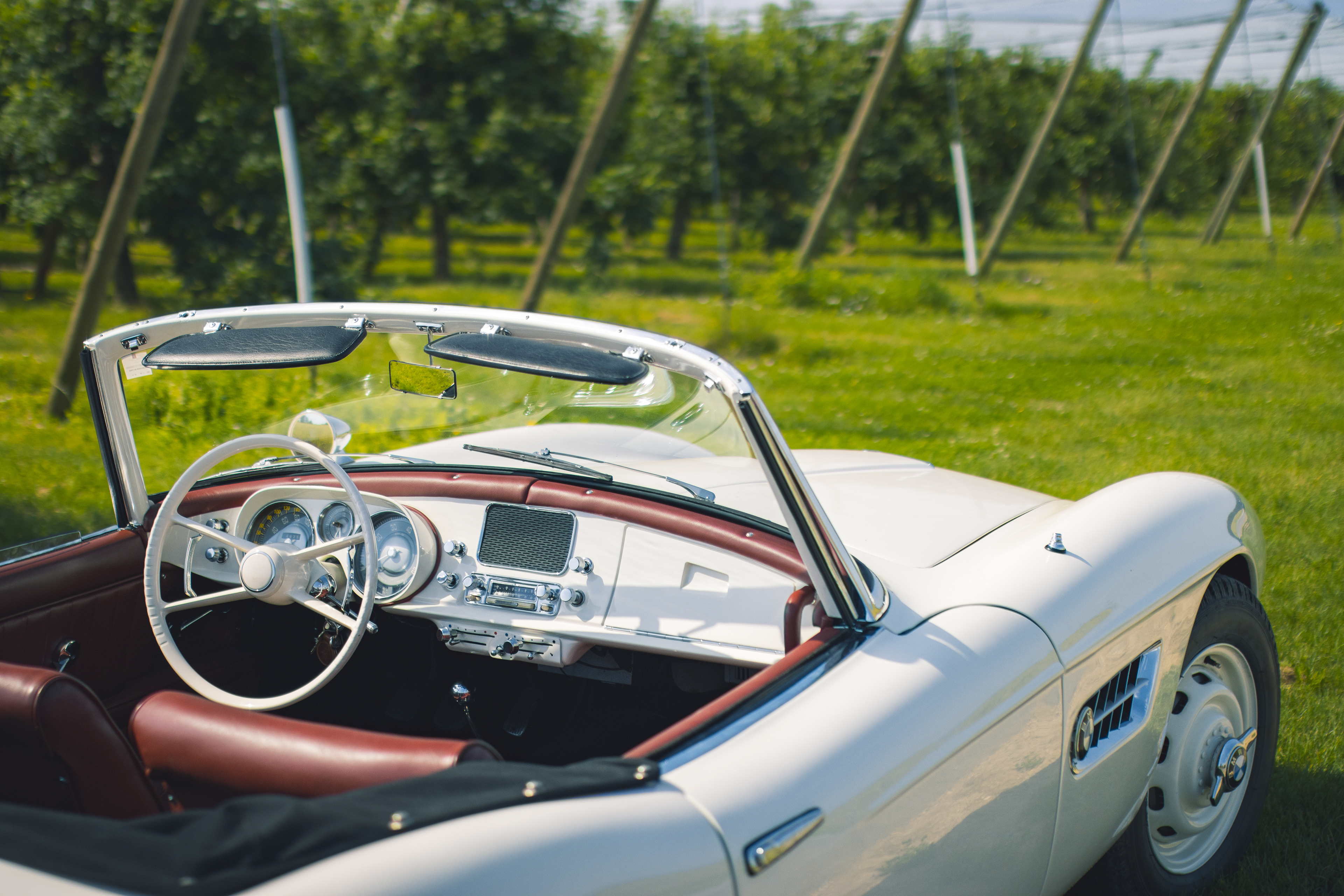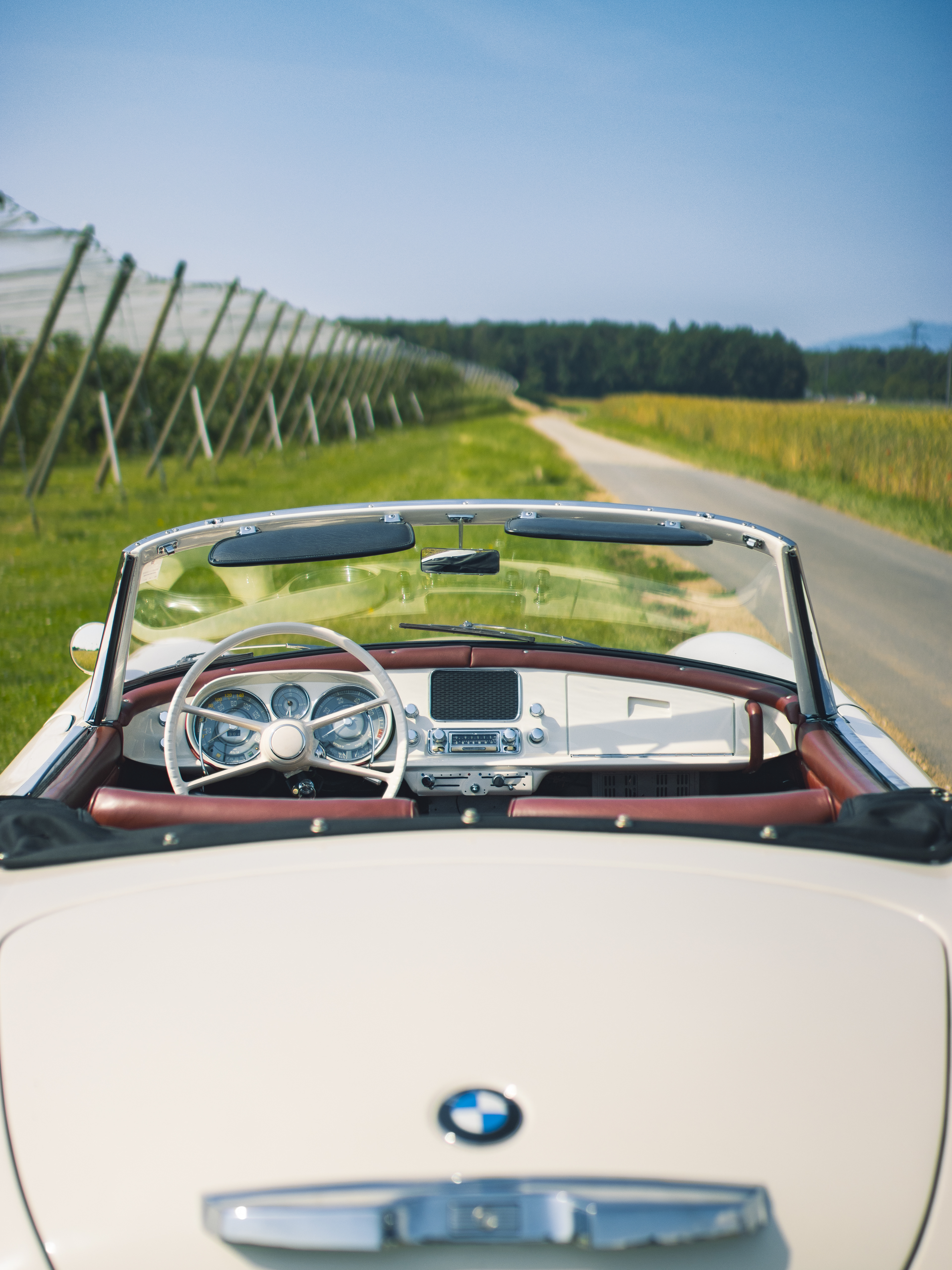 BMW 507 photographiée dans un champ surplombant le lac Léman.